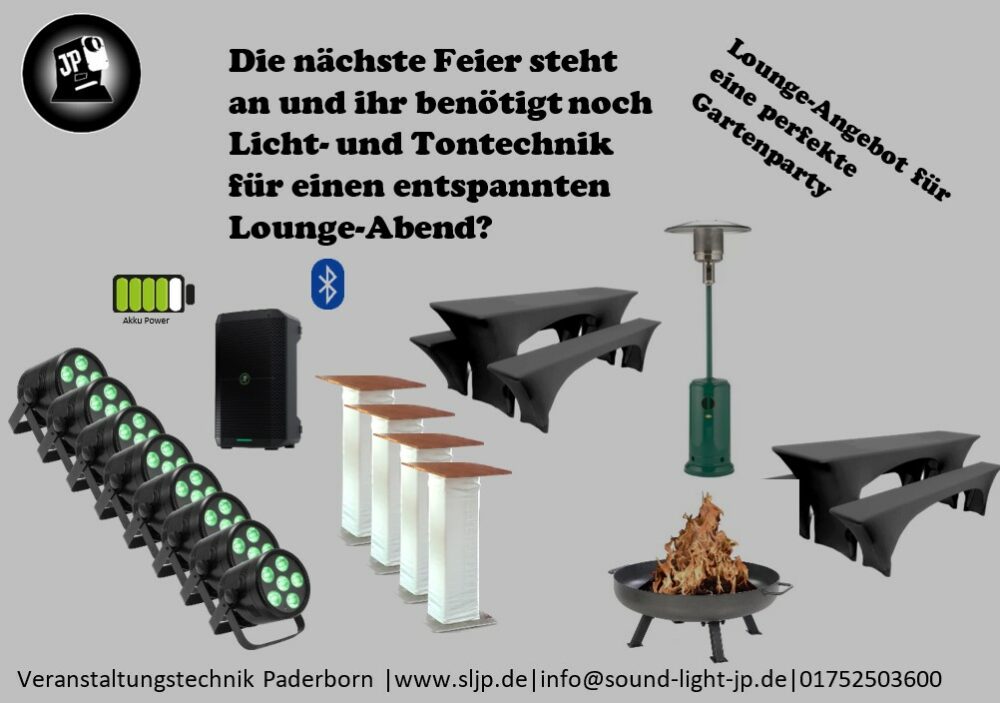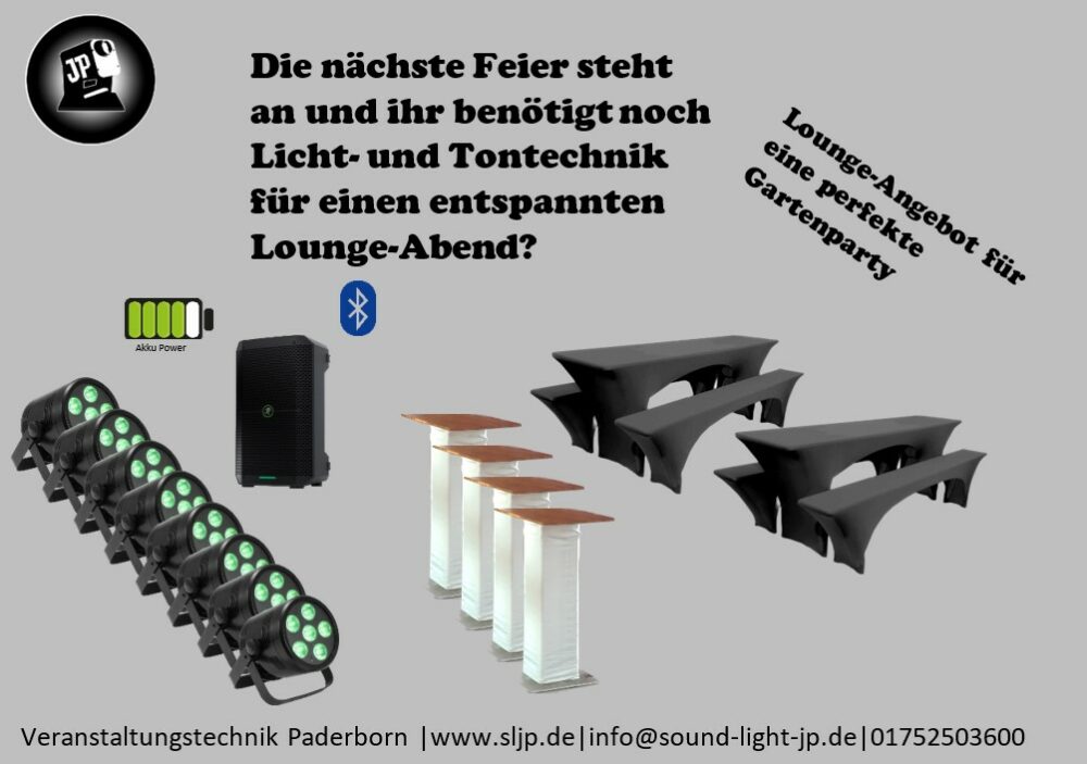 • In den Sets sind bereits der Auf- bzw. Abbau im Kreis Paderborn (max. 15km) im Preis inbegriffen. Bei einem größeren Umkreis wird eine Pauschale für die Fahrt erhoben. (Ein Selbstaufbau ist somit ausgeschlossen)